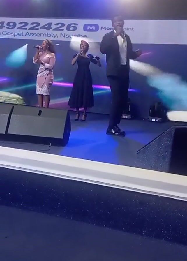 A group of five singers are performing on a stage. The stage is brightly lit with blue and purple lighting. The backdrop is a digital display with colorful designs. Four of the singers have microphones. The male singer in the middle is wearing a dark suit, and the other singers are women in dresses. They are all standing behind a white podium, and they are moving around as they sing. There are two large speakers in front of the stage. There are chandeliers hanging from the ceiling. The environment appears to be an indoor event space.