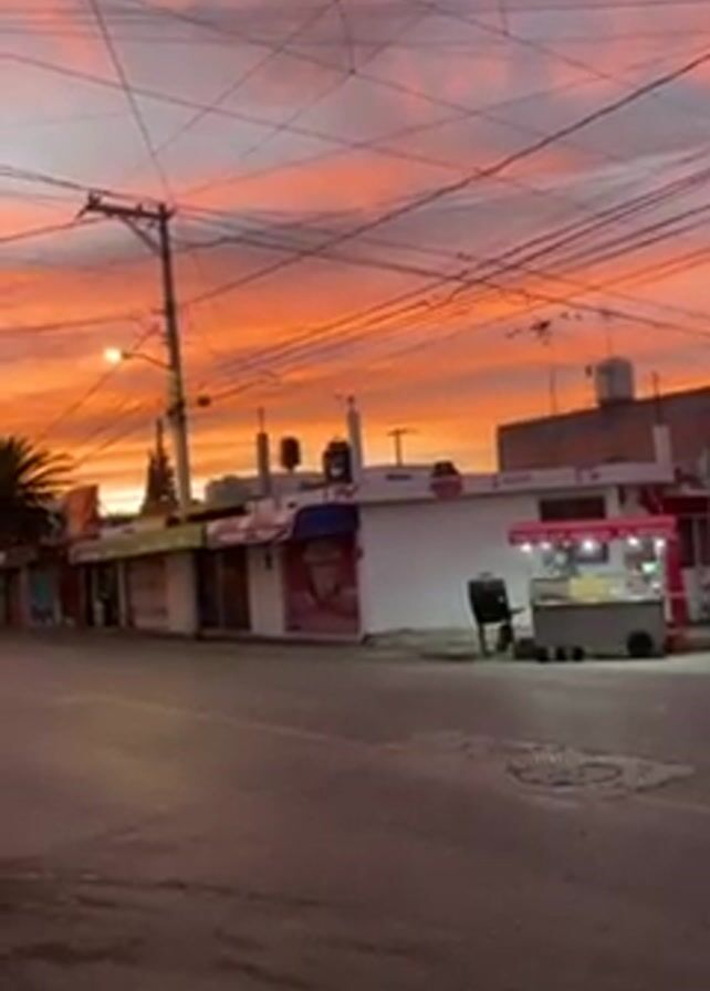street scene at sunset. The sky is ablaze with orange and pink hues. Buildings line the street, including a storefront with a colorful awning and a food vendor cart. Utility poles crisscross the sky with a tangle of wires. A person partially obscured by a dark frame is visible at one point. Some cars drive by in the background.