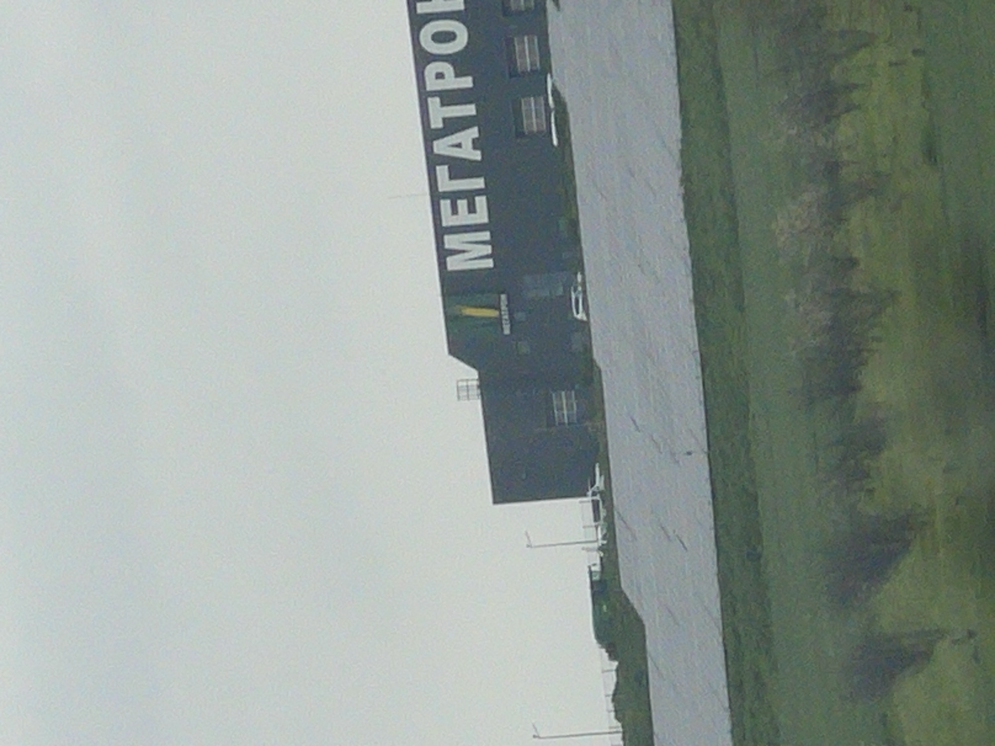 The image depicts a building with the word "МЕГАТРОН" (MEGATRON) written vertically on its side. The building is located in Bulgarovo, Bulgaria. There is a field to the right of the building. The sky is overcast. There are streetlights along the road in front of the building.