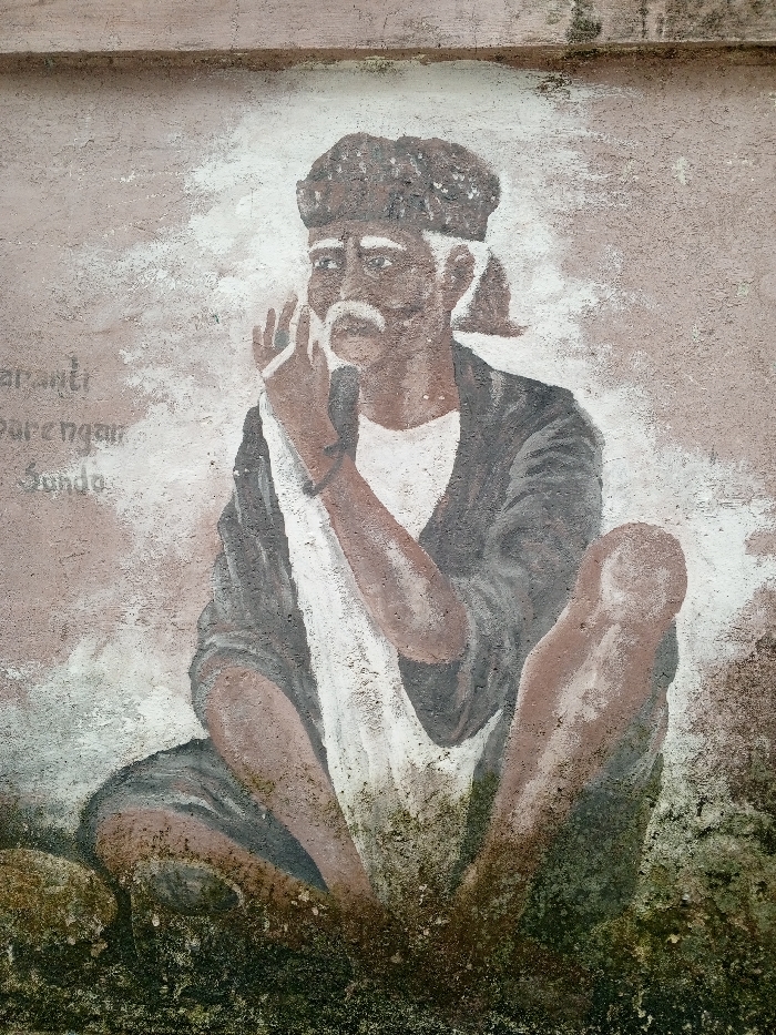 A weathered mural is depicted on a textured, light brown wall in the city of Voa Yeav, Cambodia. The painting features an elderly male figure seated, facing forward with a slight gaze to the viewer's right. He possesses a dark skin tone, a prominent white mustache, and a white patch of hair on his chin. His head is covered by a dark, textured cap or turban. He wears a dark, long-sleeved outer garment over a white inner layer. The figure's right hand is raised, with fingers slightly curled, near his mouth or lower face, while his left hand rests lower, appearing to hold part of his white garment. Faint, dark grey text, partially visible as "garanti barengan Sundo," is inscribed on the wall to the left of the figure. The wall itself shows signs of age, including discoloration, crackling, and extensive dark green biological growth (moss and algae) covering the lower portion of the image, obscuring the figure's lower legs and feet. A horizontal line, possibly a structural element or joint, is visible at the top of the frame.