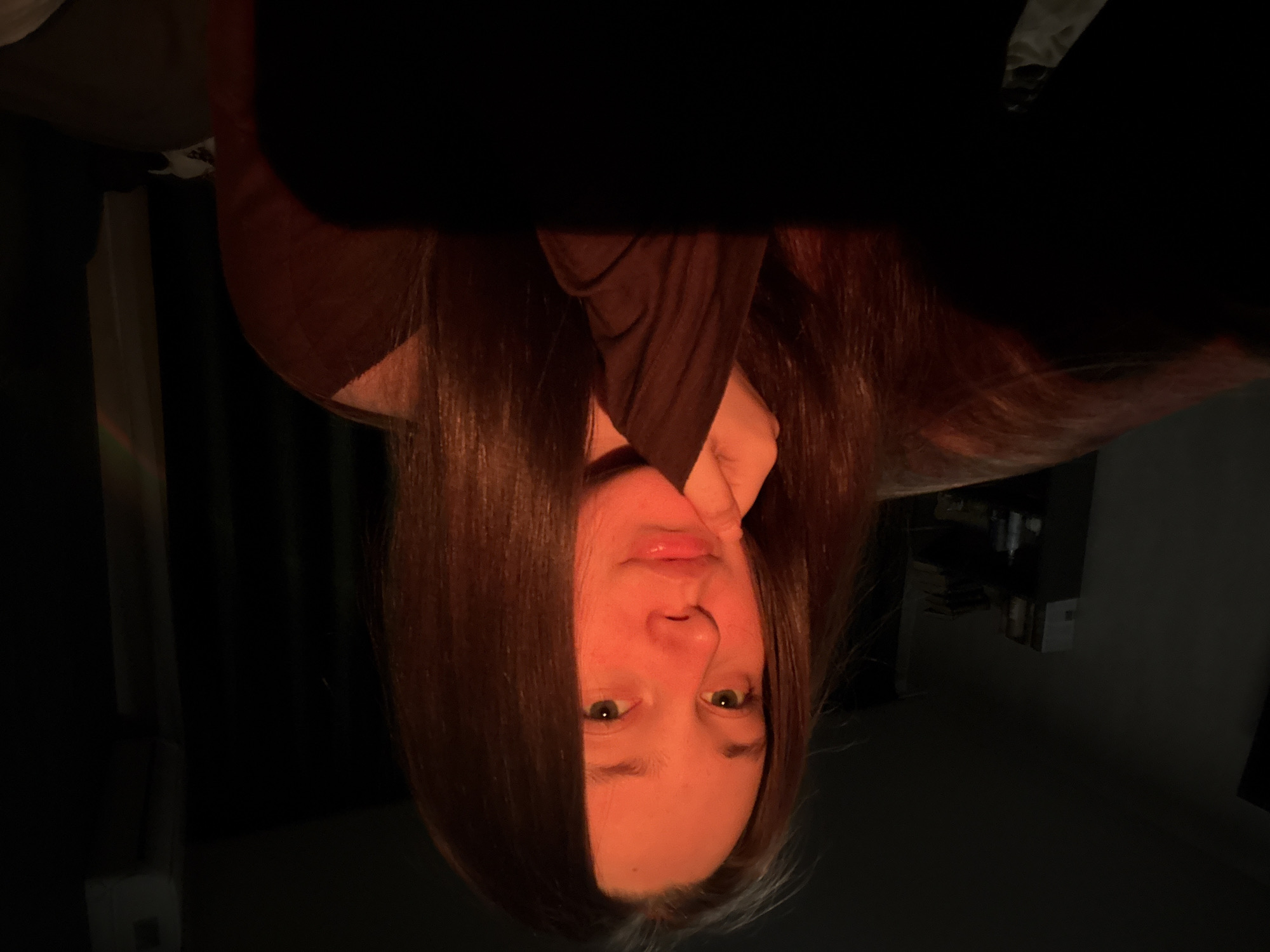 A girl with long brown hair and fair skin is positioned upside down in the frame