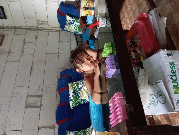 A young child with dark hair and brown eyes lies on a blue cushion decorated with a leaf pattern. She wears a pink top and blue skirt. Adjacent to her are blocks of purple, green, and pink, and a variety of household items on a cluttered surface. These items include packaging boxes and cooking utensils. The background consists of a white brick wall.