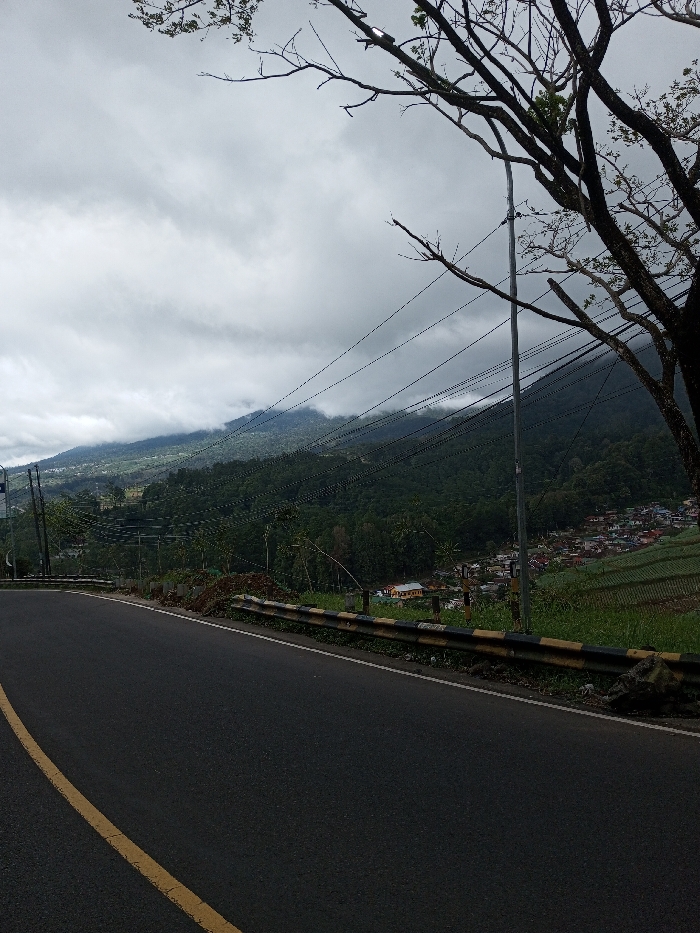 The scene depicts a mountainous, rural landscape in Phoxay, Laos, under a heavily overcast sky. A dark asphalt road with a solid yellow line on its left edge curves through the lower left foreground. A black and yellow striped guardrail lines the right edge of the road. Beyond the guardrail, a steep, green slope descends, revealing terraced agricultural fields and a cluster of residential structures with multicolored roofs in a valley below. Multiple utility poles and a network of dark electrical or communication wires span the midground. Dense, dark green forest covers the distant mountains, which are partially shrouded by low-hanging grey clouds. Bare tree branches are visible in the upper right, partially obscuring the sky. No human or vehicular activity is present.