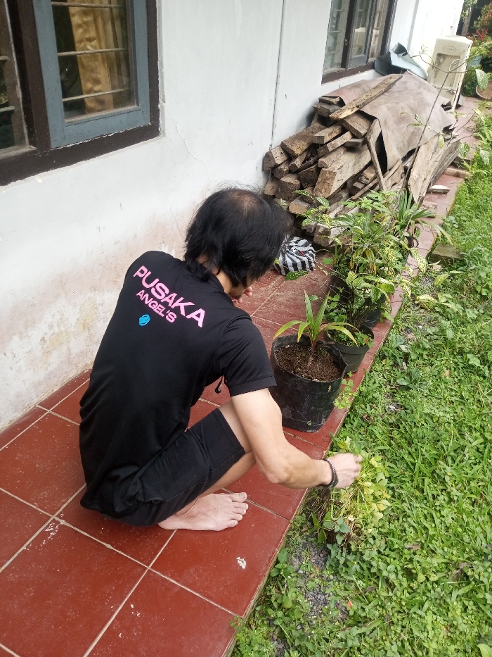 The image depicts an outdoor scene in Tecuci, Romania. An individual, seen from behind and slightly to the right, is in a squatting position on a reddish-brown tiled surface. The person has dark, medium-length hair, wears a black short-sleeved t-shirt with "PUSAKA ANGEL'S" printed in pink on the back, and black shorts. They are barefoot. The individual's right hand is extended toward a patch of green vegetation, including weeds, at the edge of the tiled path. Along the tiled path, separating it from a grassy and weedy area, are several plants in black plastic pots. In the background, a light-colored building wall features two windows with dark frames and lighter sills. Against this wall, to the right of the person, is a stacked pile of weathered wooden planks and miscellaneous debris, partially covered by a tarp-like material. A white outdoor air conditioning unit is partially visible against the wall on the far right. The ground transitions from the tiled path to an unpaved area covered in green grass and weeds.
