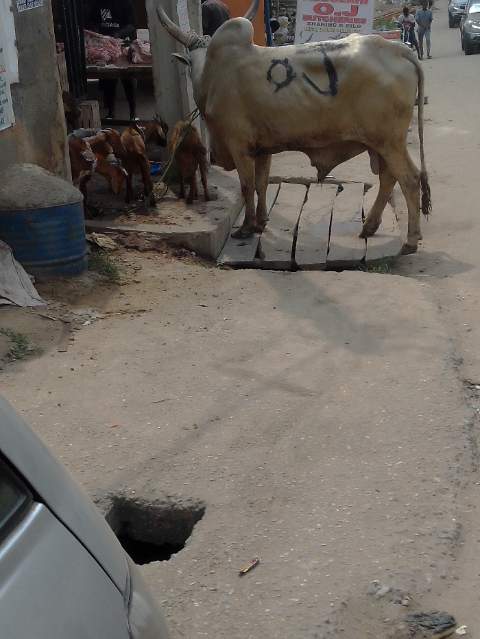 This image depicts a bustling street scene in Lagos, Nigeria, characterized by both commercial activity and livestock. A large, light-colored bull with prominent horns stands centrally, marked with the black letters "O.J" on its left flank. It is positioned on concrete planks covering an open gutter adjacent to a raised concrete sidewalk. Several small, brown goats are gathered near the base of a concrete pillar, feeding on vegetation, close to the entrance of a butcher shop. Behind the goats and partially obscured by the pillar, a person wearing a black shirt with a "Balenciaga" logo is visible, standing behind a counter displaying raw meat. Above this area, a yellow and red sign for "ALHAJI O.J BUTCHERIES SHARING & KILO" confirms the commercial nature of the establishment. The presence of "O.J" on both the bull and the butcher shop sign suggests a direct connection. The foreground shows a dusty, paved road with a distinct pothole on the left side, near the front bumper of a silver vehicle which is partially visible. In the background, further down the street, two individuals are present: one on a motorcycle and another walking. A blue metal barrel is situated next to the concrete pillar on the left. Shadows are cast across the dusty road from the subjects.