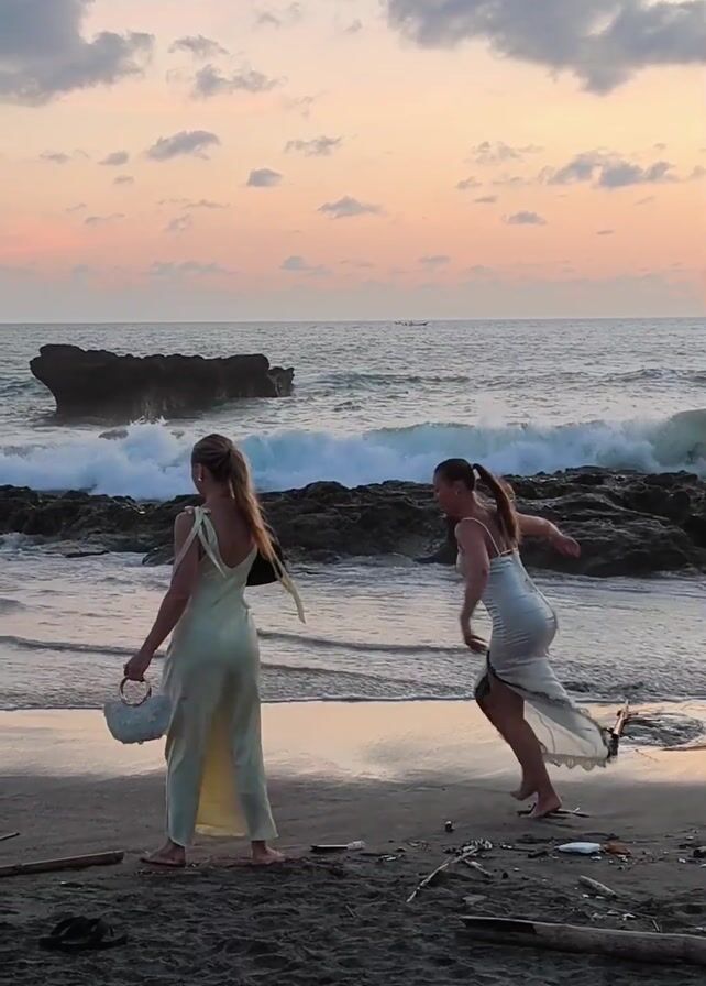 Two women wearing light-colored dresses walk along a sandy beach at sunset. The sky has pink and orange hues, and the ocean has moderate waves breaking against some rocks in the distance and along the shoreline. The woman on the left carries a small purse and walks with a phone in her hand. The woman on the right was squatting, but stands up and joins her companion. There is driftwood scattered on the sand near them.
