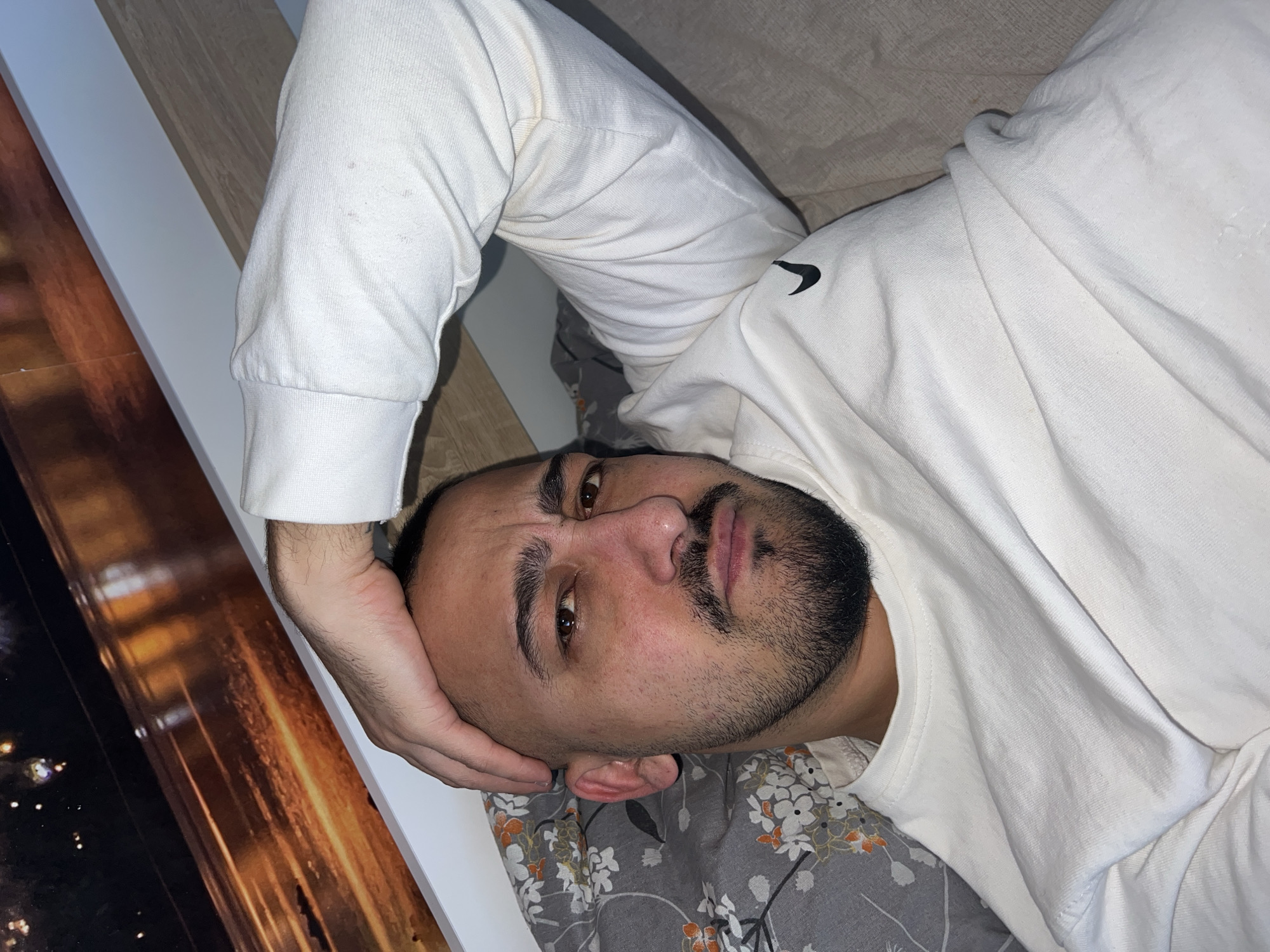 A man with brown eyes and a dark beard is lying down, resting his head on his hand. He is wearing a white long-sleeved shirt with a black Nike logo visible on the shoulder. He appears to be on a bed with a gray floral patterned sheet. To the left, there's a partial view of what appears to be a framed print or a photograph with cityscape elements. The provided location is Shumata, Bulgaria, but there's no visual evidence to confirm the specific location from the image.