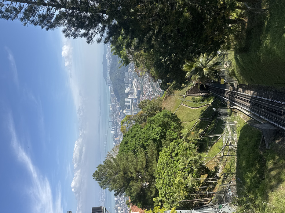 A verdant hillside descends towards a cityscape bordering a wide body of water, partially obscured by clouds and haze under a blue sky. The dense urban area is juxtaposed with lush trees dotting the landscape. A funicular railway track cuts diagonally through the green slope, leading towards a dark tunnel. The scene is framed by foliage, adding depth to the vista.