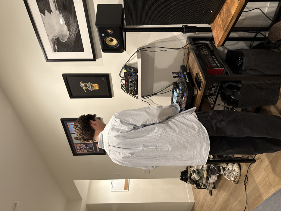 A person wearing a striped shirt and dark pants is standing near a DJ setup in a room with light walls and wood floors. The setup includes a mixing console, speakers, and a wooden desk. On the wall are several framed pieces of art, including a black and white wave photograph and other smaller pieces. A shelf below the speaker holds electronic equipment. A shoe rack filled with sneakers is on the floor near the person.