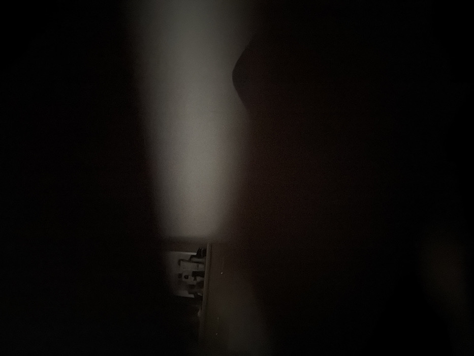 The image presents an obscured, dimly lit scene located in Dar Bouazza, Morocco, under conditions of very low ambient light. A rectangular opening in the upper left quadrant provides a partial view into an interior space. Within this opening, several dark, indistinct, vertically oriented objects are visible against a slightly lighter background, resembling furniture or structural components. Below this aperture, a flat, light-toned surface contains scattered small, light-colored particles. The majority of the foreground and the lower and right sections of the image are occupied by dark, undifferentiated areas. A blurry, lighter grey region extends horizontally across the middle right of the frame, and a dark, rounded, out-of-focus form is present in the lower right mid-ground. No identifiable individuals or specific actions are discernible within the scene.