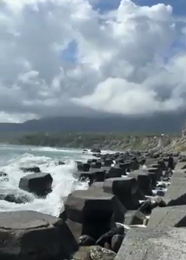 rocky shoreline with large, gray, angular blocks protecting the coast from the ocean. Waves crash against the blocks, creating white foam. In the background, a coastline stretches into the distance, with mountains partially obscured by clouds. The sky is a mix of blue and white, with puffy clouds dominating the scene.
