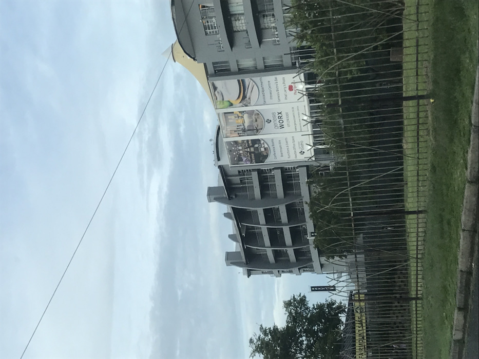 A low-angle shot depicts a modern, multi-story gray building with curved balconies, partially obscured by a metal fence and greenery. A large banner advertises Genesis Worx, mentioning serviced apartments, a fitness center, and other amenities. Lower down, another sign indicates "Clicks" and "FA RIADUNT SAGE LICKS." The sky is overcast, adding to the somewhat muted color palette of the scene.