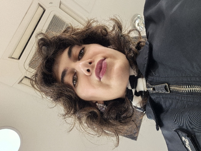 A person with medium-length, dark brown, curly hair, light-colored eyes, and pinkish-purple lipstick is depicted in a low-angle, close-up shot