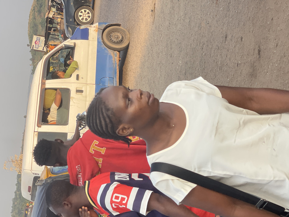 A woman in a white top looks off to the side. Braided hair is visible. Behind her, three people are wearing colorful shirts. A white van with a blue stripe and an advertisement is adjacent. The van is open, with two passengers inside. The street is visible.