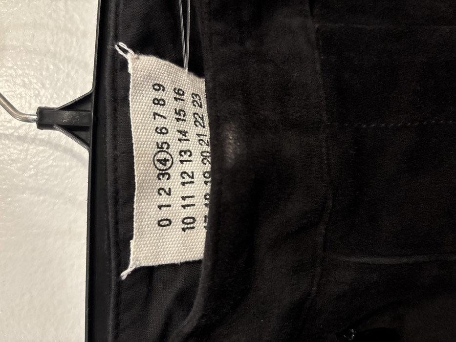 A close-up reveals a clothing item hanging on a black hanger. The fabric is dark, possibly black suede or velvet. A label is attached, featuring a distinctive design: a series of numbers from 0 to 23, with the number 4 circled. The tag is white with black numbering and partially obscured by the fabric. The label's positioning is slightly skewed.