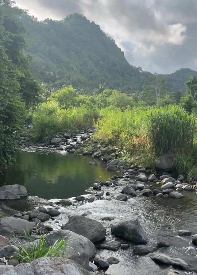 stream flowing through a rocky riverbed in a lush, green environment. The water is clear and gurgles as it flows over the rocks. Tall grasses and trees line the banks of the stream. In the background, a mountain is visible under a cloudy sky. The overall setting is peaceful and natural.