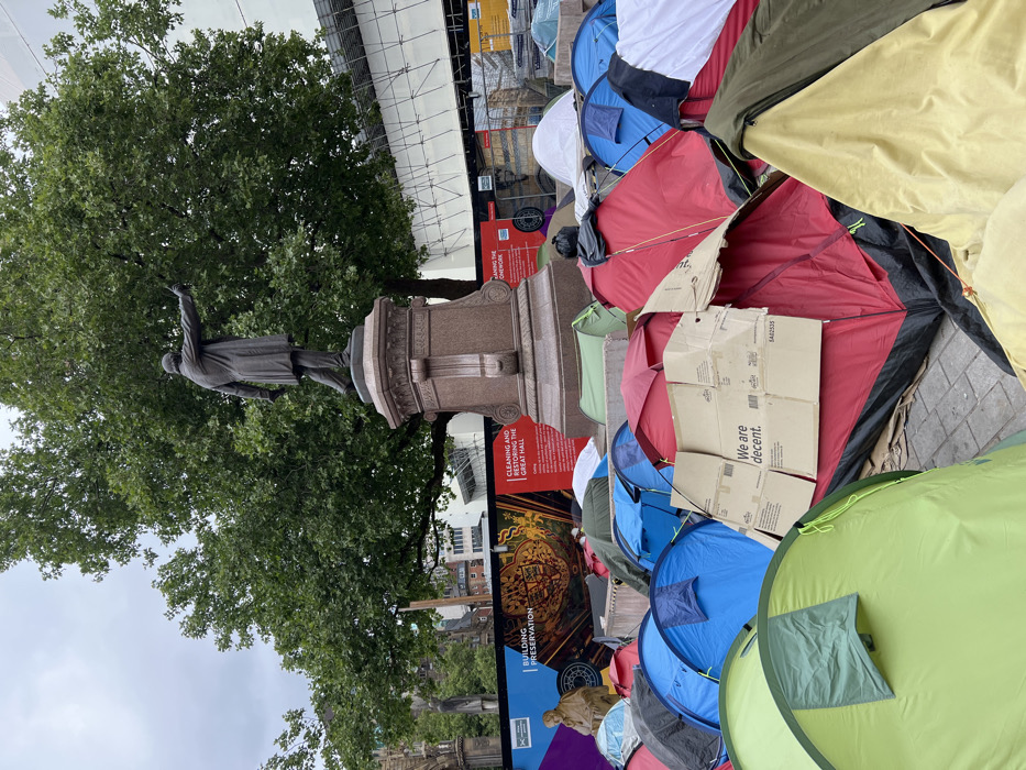The image captures a scene in Manchester, United Kingdom, located at the coordinates 53.479 latitude and -2.246 longitude. The scene is dominated by a large, bronze statue of a man, positioned on a pedestal and surrounded by greenery. He appears to be addressing a crowd, his right hand raised in a gesture of oratory. Behind the statue, several large construction signs are visible, suggesting ongoing renovation or development work. The statue is situated on a raised platform, and below it, a collection of tents, some blue, some red, and others green, are pitched on the ground. Some of these tents appear to be made from thin materials, and some have cardboard signs attached, one reading "We are decent." These tents suggest the presence of individuals experiencing homelessness. The overall scene presents a juxtaposition of grandeur and hardship, with the statue signifying historical importance, and the tents indicating the current reality of homelessness in the city. The scene is illuminated by a bright midday sun, casting shadows across the scene.