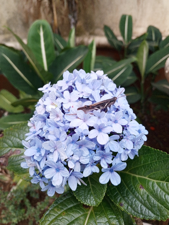 The image displays an outdoor scene in Weintiapa, Liberia, featuring a close-up of a flowering plant. A dark brown and grey striped grasshopper, approximately 2-3 cm long, with visible antennae, rests centrally upon a dense, spherical cluster of light blue hydrangea flowers. Each floret within the cluster is small, comprising four or five petals. The main subject is framed by prominent dark green, ovate leaves of the hydrangea plant in the foreground. The background, rendered out of focus, shows additional blurred green foliage and an indistinct light-colored vertical structure, consistent with a wall or building element. No human presence or specific interactions are depicted.