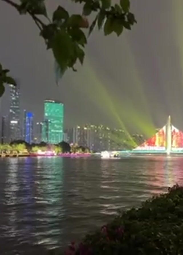nighttime scene on a riverfront promenade in a city. On the opposite bank of the river, a bridge is illuminated with colorful lights, and beams of light shoot upwards into the sky. Several skyscrapers are visible behind the bridge, also lit up. A group of people is standing along the promenade, some holding up their phones to take pictures or videos of the spectacle. The water reflects the lights from the bridge and buildings. Lampposts illuminate the walkway, and greenery is visible along the edge of the promenade. The overall atmosphere is festive.