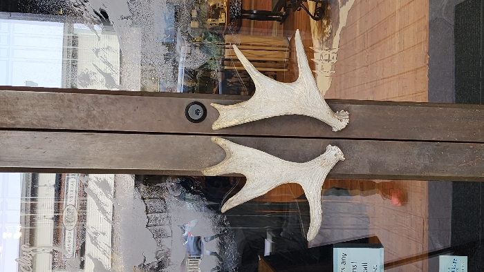 An exterior, eye-level photograph depicts the main entrance of a retail establishment located in Jackson, Wyoming, United States of America. The entrance consists of two glass doors framed by dark, vertical stiles, likely made of distressed wood or metal. Each door is fitted with a large, light-colored antler, possibly moose or elk, oriented horizontally, serving as a distinct door handle. A black circular deadbolt lock is present on the stile of the right door, positioned centrally between the top parts of the antler handles. The upper sections of the glass doors feature frosted or etched designs depicting mountain landscapes. Mirrored reflections on the glass clearly display text including "JACKSON HOLE" and "COMPANY" from an opposing facade, along with a white building and a silver vehicle. The lower left glass panel also has a frosted design of a horse. Through the transparent portions of the glass, the interior of the store is visible, revealing light-colored wooden flooring, a dark display table with ornate legs, and various merchandise, including what appears to be jewelry. A light-colored animal hide rug is visible on the floor inside the store to the right. A partial reflection of a person, likely the photographer, is visible on the lower left door, showing dark pants and reddish-brown footwear. A dark, textured entrance mat lies on the ground directly outside the doors. A partial white sign with fragmented text, including "s any", "ns!", "call", and "520", is affixed to the lower left door.