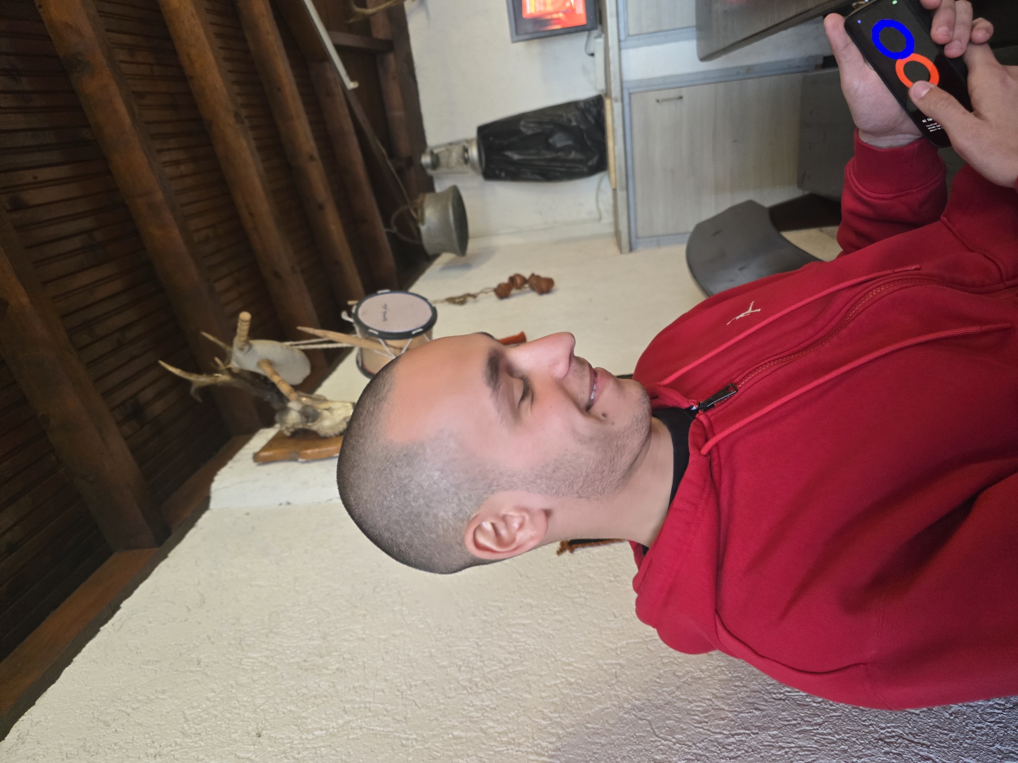 A man with a shaved head is holding a phone with blue and red circles on the screen. He is wearing a red hoodie. He is indoors. Behind him is a wooden ceiling and wall. There is a drum, a television, and some antlers visible. There are no specific identifiers to pinpoint the location in Burgas, Bulgaria.
