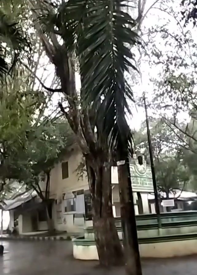 The video depicts a rainy scene outdoors. A tall, thin palm tree is in the center, with other trees of varying sizes surrounding it. A white building is visible in the background to the left of the palm tree, and another structure, possibly a gazebo, with green and white elements is on the right. The ground appears wet and reflective due to the rain. There are no people visible in the video.