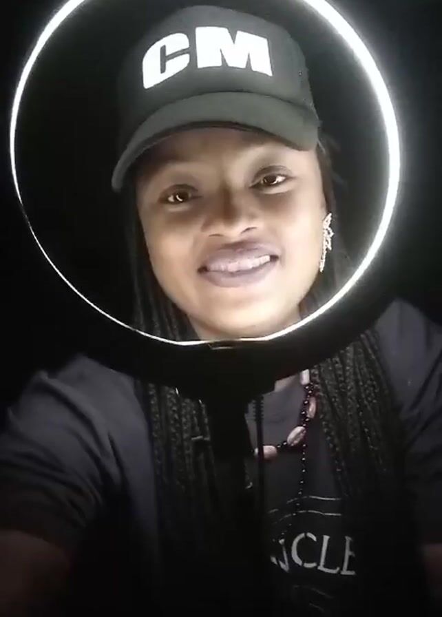 A woman is standing in front of a ring light. She is wearing a black baseball cap with the letters "CM" in white, a black T-shirt with the word "UNCLE" partially visible, a beaded necklace, and dangling earrings. Her hair is styled in braids. She is smiling and looking directly at the camera. The background is dark, emphasizing the light from the ring.