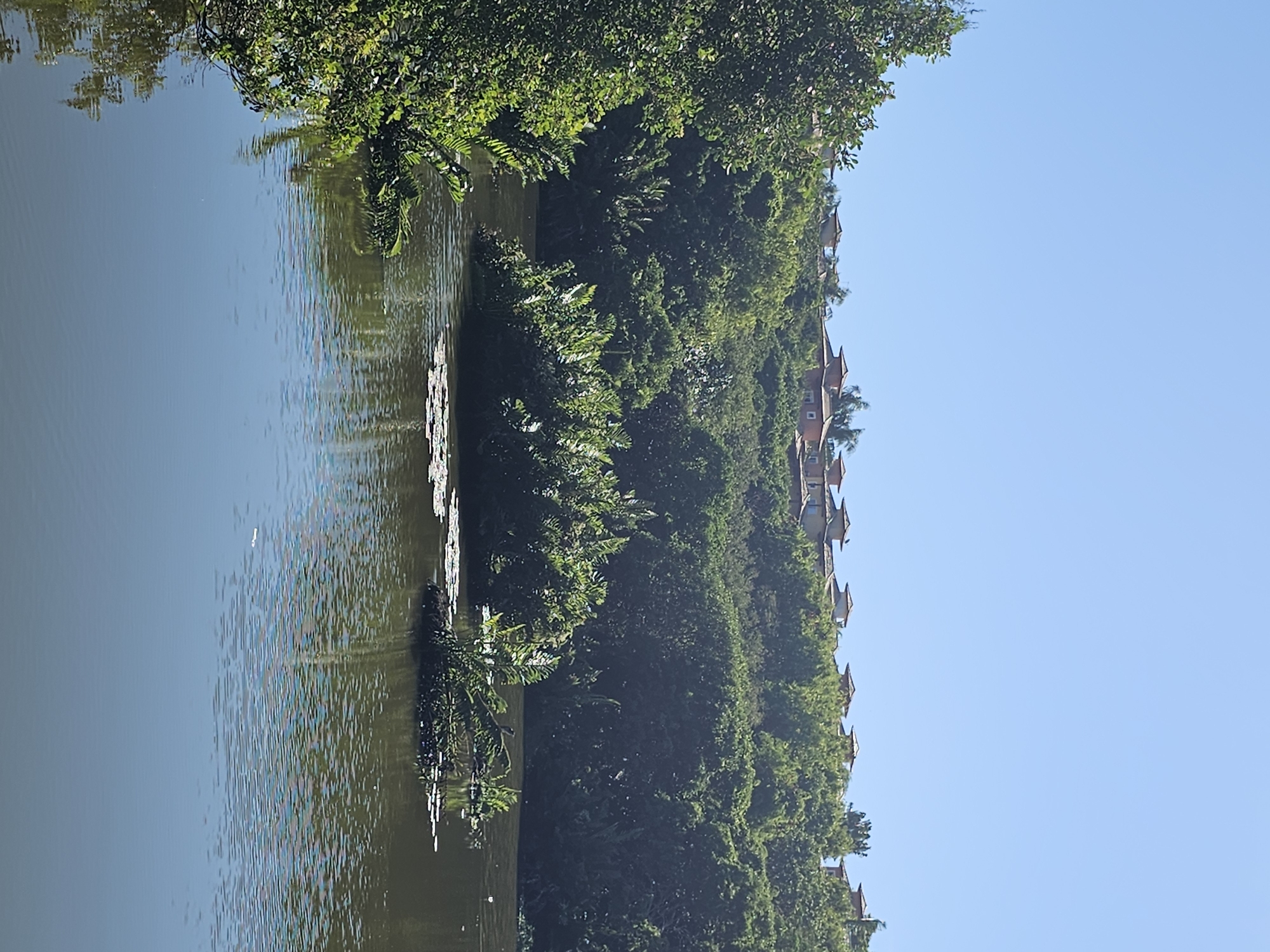 view of a body of water with trees and foliage on the right side, likely a hillside, with buildings visible among the trees