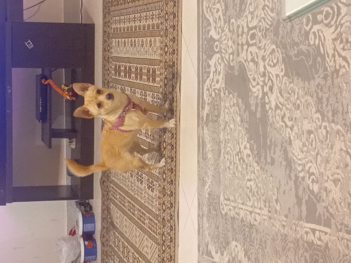 - "An indoor scene in the city of Parand, Iran, features a small, fawn-colored dog standing centrally on a patterned rug" by FM-jqQSo1, licensed under CC BY 4.0