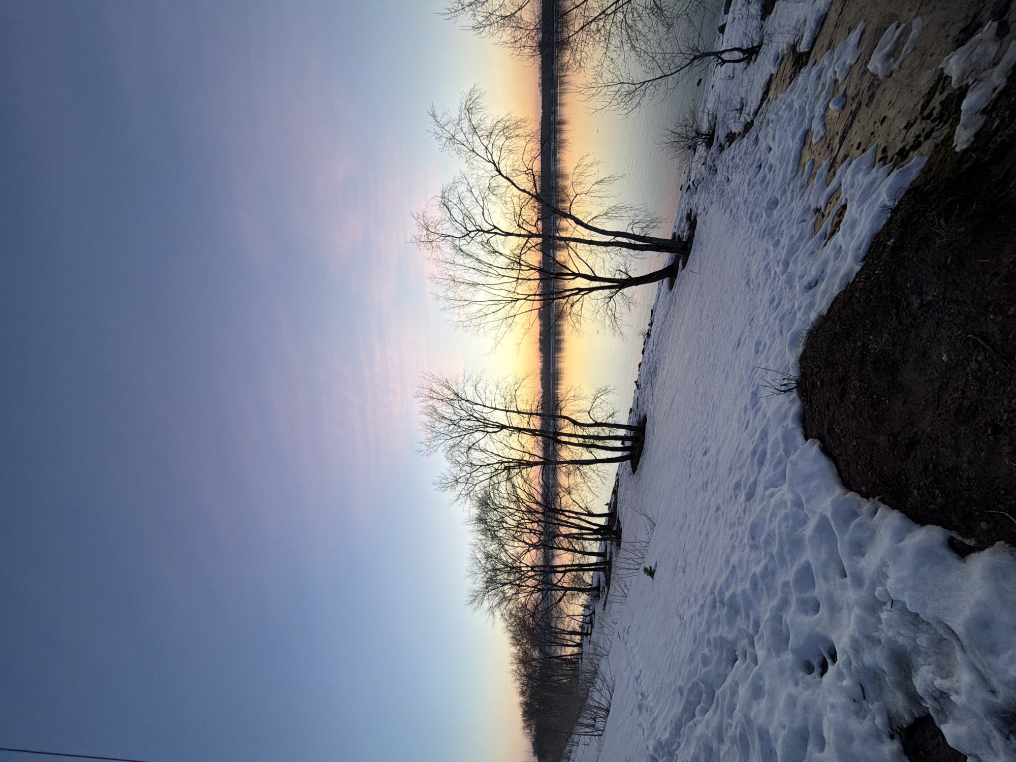 The image depicts a winter scene, likely captured near the Kama River in the city of Chaikovsky, Russia. The sky transitions from a deep blue to a lighter gradient of pink and yellow near the horizon, reflecting the hues of a setting sun or dawn. A narrow band of water, representing the river, is visible, mirroring the colors of the sky. The shoreline is covered in snow, with patches of darker earth visible in places. Silhouetted trees, bare of leaves, stand along the bank, their forms sharply contrasted against the lighter sky and water. The scene is still and serene, capturing the quiet beauty of a winter landscape.