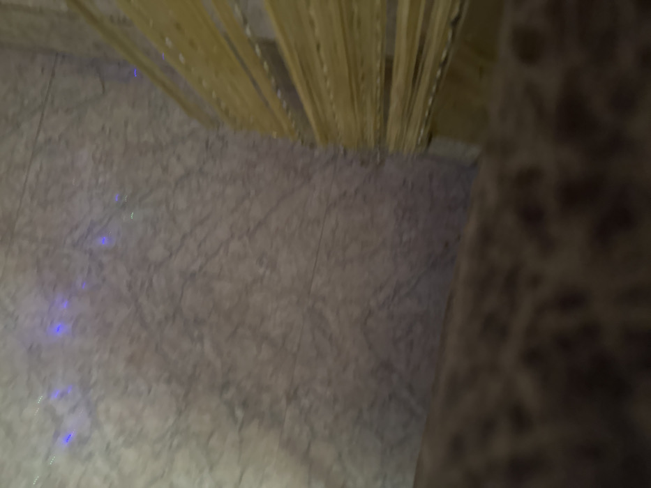 The scene is an interior space in Laminga, Nigeria. The background consists of a light-toned, vertically oriented wall displaying a distinct grey and white marbled pattern, featuring faint, sporadic blue and green light reflections. To the right, a structure is present, composed of numerous horizontal, parallel strands of pale yellow material, consistent with uncooked spaghetti or similar pasta, arranged in multiple rows. The immediate foreground is blurred, revealing a dark brown, textured surface. No individuals, actions, or specific interactions are visible.