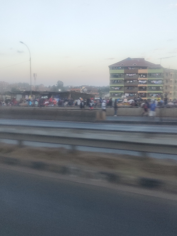An elevated road with guardrails is in the foreground, likely viewed from a moving vehicle. In the middle ground, a pedestrian walkway appears crowded with people. There is a market or gathering place with tents and makeshift structures along the walkway. A large apartment building with a green exterior and a reddish-brown roof is visible in the background. The sky is overcast, creating a muted color palette. A tall lamppost and communication towers are also present.