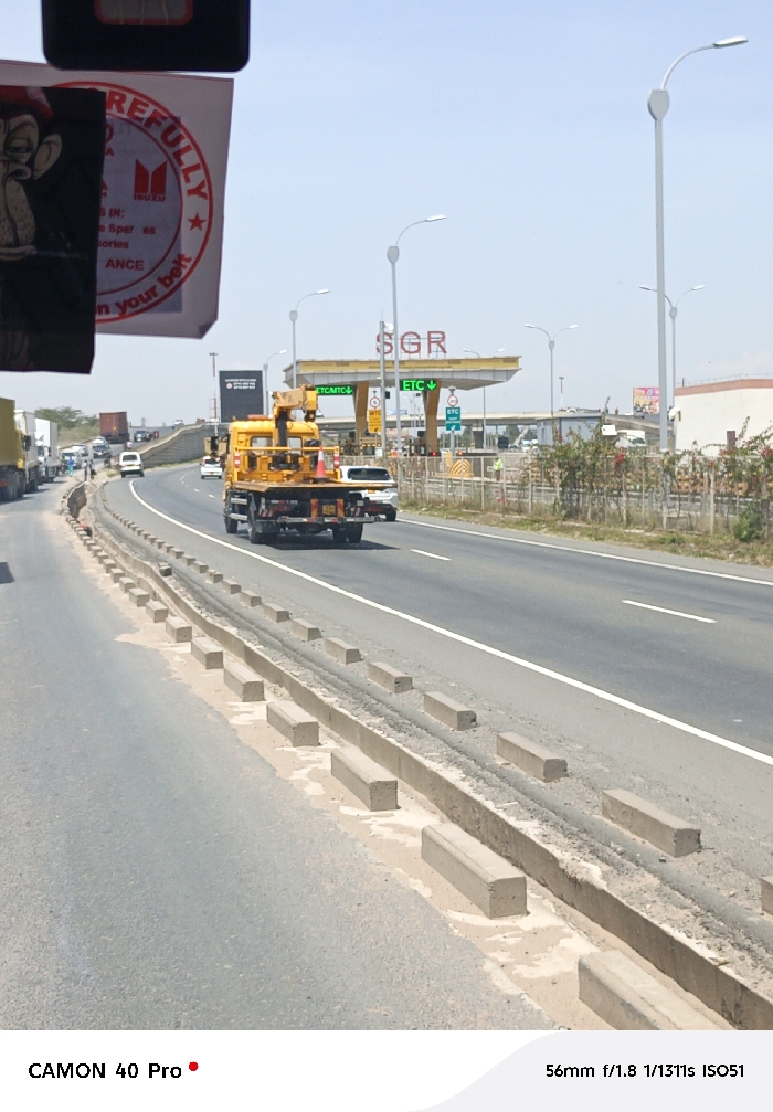 A bright sunny day on a highway shows a yellow Isuzu truck with an attached crane moving away from the camera, nearing the SGR toll station