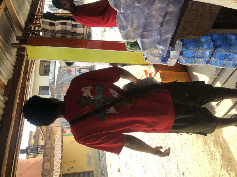 This image depicts an outdoor market or roadside stall in Satellite Town, Nigeria, under bright daylight conditions. In the foreground, an adult male stands with his back to the camera, facing away from the stall. He has short, dark, curly hair and is wearing a loose-fitting red t-shirt. The t-shirt's back features a large dark graphic consisting of a cross-like shape with several white, stylized figures resembling ghosts or abstract shapes, accompanied by text including "mother mc queen" and "FAST." He wears dark olive-green cargo shorts and a dark shoulder bag with a patterned texture, slung across his body from left shoulder to right hip. A light-colored bracelet is visible on his left wrist. To the right of the main subject, within the stall, another male figure with dark skin is partially visible, also wearing a red t-shirt and facing away from the camera. Further back, a third individual in a white shirt is partially visible. The stall itself has a rudimentary wooden beam and corrugated metal roof structure. A vertical support beam, painted in alternating yellow and red sections, stands prominently to the right of the main subject. On the right side of the frame, a significant quantity of water is displayed for sale. This includes stacks of clear plastic bottles with blue caps, grouped into six-packs, and numerous clear plastic sachets of water bundled together and piled high on a wooden surface. Behind these, some items with green labels are visible. Behind the main subject, on the ground to his left, two large, orange-yellow plastic jerrycans are present. Hanging behind the yellow and red post are textiles or mats with black and white checkered patterns. The ground outside the stall is unpaved, consisting of light brown earth. In the background, various buildings are visible under a clear, bright sky. These include a single-story yellow building with a corrugated metal roof, a taller light-colored building with a black water tank on a stand, and other residential-style structures with light-colored walls and corrugated metal roofs. Some structures appear less permanent, possibly utilizing tarpaulins.