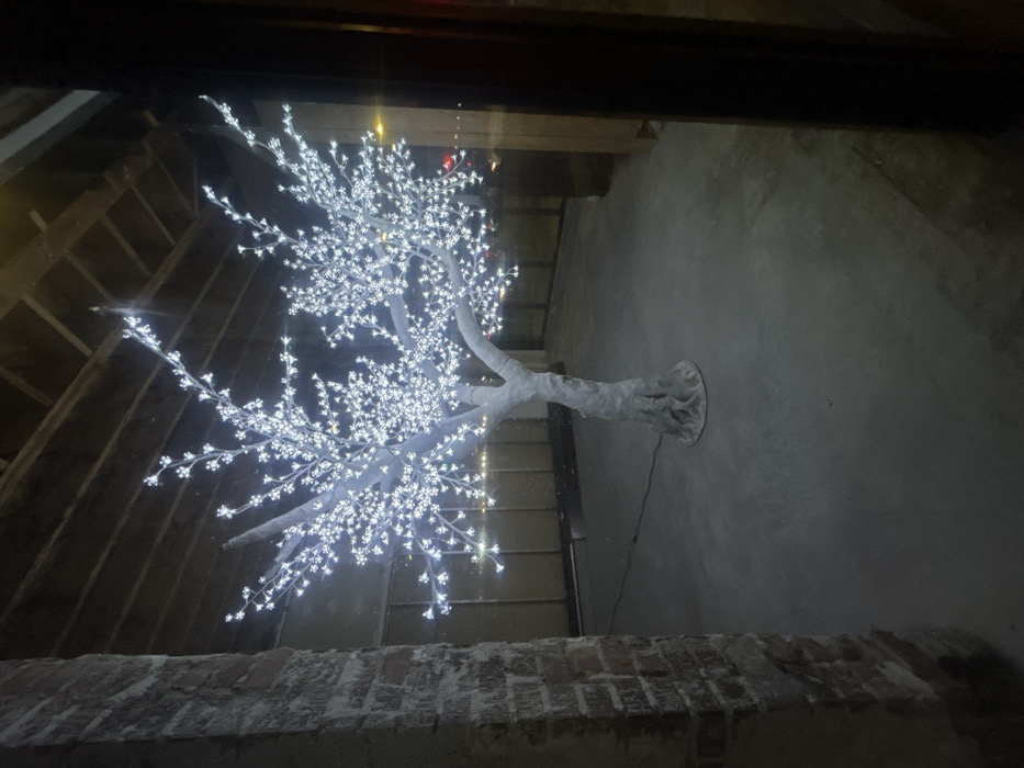 - "An artificial tree covered in tiny white lights stands against a gray concrete wall, illuminated in the darkness" by FM-JqEJc2, licensed under CC BY 4.0