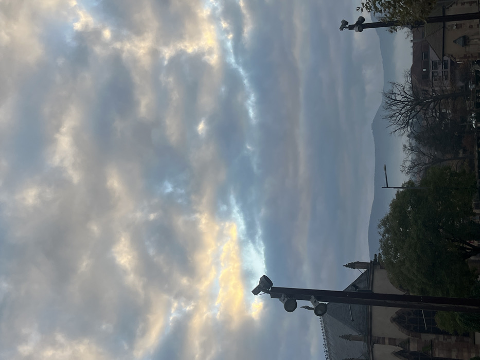 The image captures an outdoor urban landscape in Obernai, France, under an overcast sky. The sky is largely covered by dense, textured clouds, exhibiting varying shades of grey, blue, and white, with prominent areas of golden-yellow light visible through gaps on the left and upper-left, suggesting indirect illumination. In the left foreground, a tall, dark metal light pole equipped with three downward-facing spotlights stands prominently. Behind and to the left of this pole, the upper portion of a large stone building with a steeply pitched dark roof is visible. This structure is identified as the Church of Saints Peter and Paul due to its Gothic architectural style, characterized by pointed arch windows and buttress-like features. To the right of the church, a green deciduous tree with dense foliage occupies the mid-ground. Further into the mid-ground, a modern street lamp with a single horizontal light fixture is visible, positioned in front of a distant mountain range. Another dark metal pole, fitted with two downward-facing spotlights, is partially visible on the far right of the frame. Scattered bare trees and several multi-story buildings with dark roofs and light-colored facades are present in the mid-ground to the right. The background features a hazy, muted silhouette of mountains, consistent with the Vosges mountain range surrounding Obernai. No individuals, overt actions, or interactions are discernible within the scene.