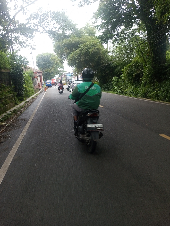 A person wearing a green Grab jacket rides a motorbike on a paved road. Other vehicles are visible in the distance. The road is lined with trees and greenery on both sides. A white line marks the edge of the road on the left, and short yellow lines are sporadically present on the right. The scene appears to be captured from behind the motorbike.