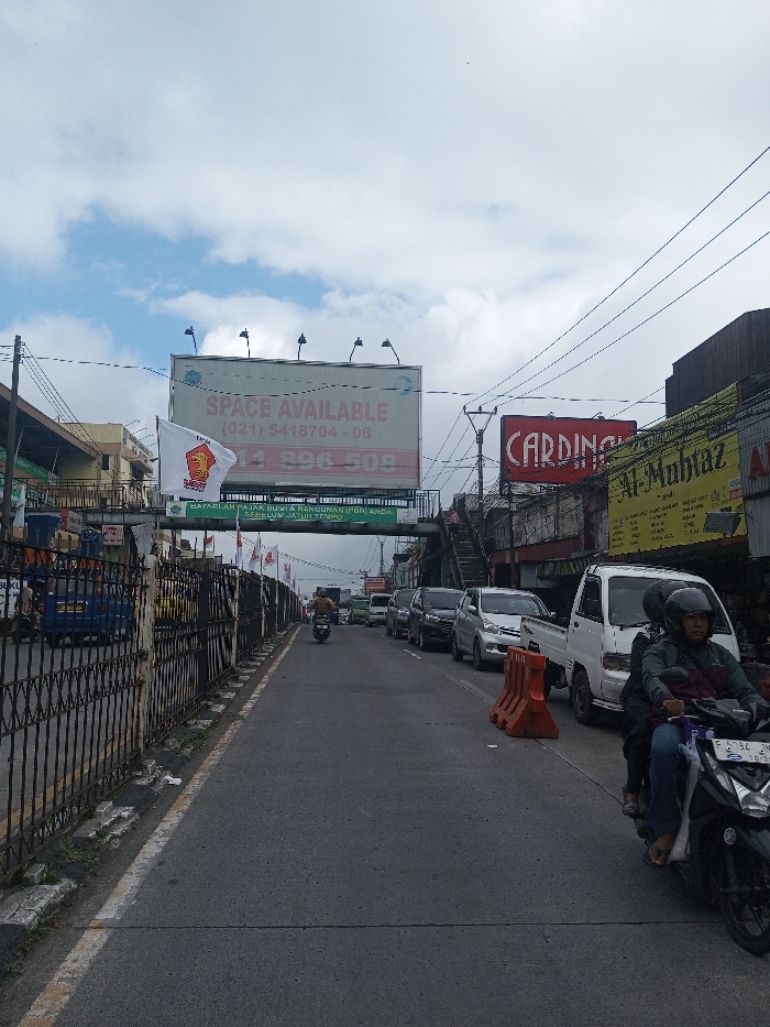 This image depicts a bustling urban street scene in the city of Thotagamuwa, Sri Lanka, under a partly cloudy sky. The perspective is from the roadside, looking down a two-lane asphalt road. In the immediate foreground on the right, a black motorbike with two male occupants is visible, moving towards the viewer. The driver wears a dark jacket and a black helmet, while the passenger behind him is partially obscured. An orange plastic road barrier sits on the asphalt next to the motorbike. On the left side of the road, a dark metal fence with vertical bars lines the street, separating it from an adjacent area or elevated structure. Several small white flags, each displaying a red political party logo resembling a stylized bull's head, are affixed to this fence. The road extends into the midground, where a line of vehicles is either parked or slowly moving on the right side. This queue includes a white compact pickup truck, a silver minivan, and several dark-colored cars. Further down the road, a single individual on a motorbike is seen traveling away from the viewer. Above the street, a large rectangular billboard dominates the upper midground, displaying the text "SPACE AVAILABLE" and two sets of contact numbers: "(021) 5418704 - 06" and "011 896 508". The billboard is illuminated by spotlights mounted on its top edge. Directly below this billboard, a green banner spans the width of the street, carrying text partially visible as "BAYARILAH PAJAK BUMI & BANGUNAN KOP ANDA SEBELUM JATUH TEMPO". To the right of the billboard, a prominent red sign with white lettering displays the word "CARDINAL." Further right, a yellow sign with "AL-MUHTAZ" is visible above a storefront. An elevated pedestrian bridge structure with visible stairs ascending from the right side of the street is also present. Buildings, likely commercial establishments, line both sides of the street, extending into the background. Overhead power lines crisscross the upper portion of the frame. The sky is predominantly light gray with patches of white and blue clouds. The road surface is black asphalt, bordered on the left by a white solid line.