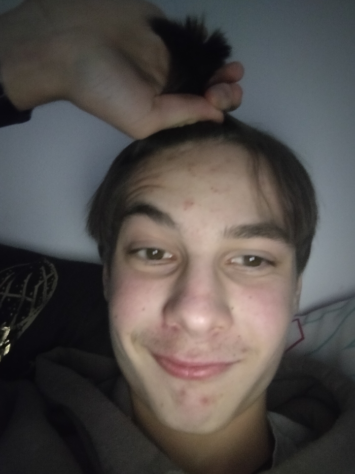 **Location:** Indoors, likely a private residence, in the city of Unknown, Unknown. **Scene Description:** A close-up, head-and-shoulders shot of a young male subject with light brown hair and a light complexion. The subject displays a slight smile, with visible stubble on his upper lip and chin, and multiple red blemishes on his forehead, cheeks, and chin. He wears a grey hooded sweatshirt. A light-skinned hand grasps a small, dark tuft of his hair at the crown of his head. To the lower left, a dark object with a light, intricate pattern is partially visible. To the right, a section of a white pillow with a faint red linear pattern is present. The background is a uniform light grey/white surface.