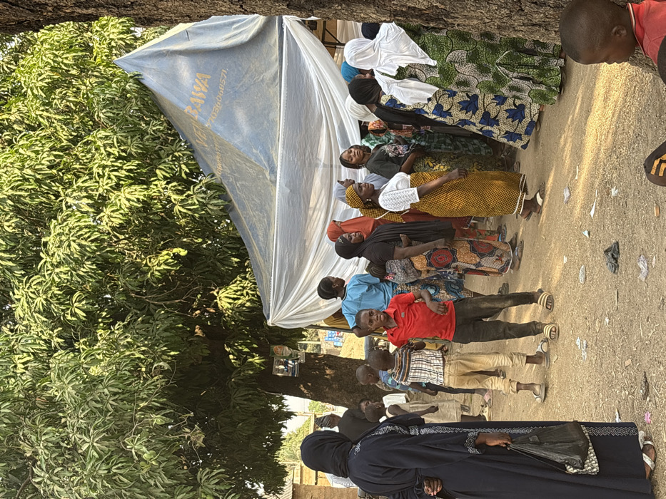 A group of people of varying ages stand outdoors near a large tree and a plastic-covered structure. Most are facing towards the left of the frame. The individuals in the group are dressed in a variety of colorful clothing, including patterned dresses, solid-colored shirts, and traditional garments such as a hijab. Several children are also present. The ground is strewn with debris.