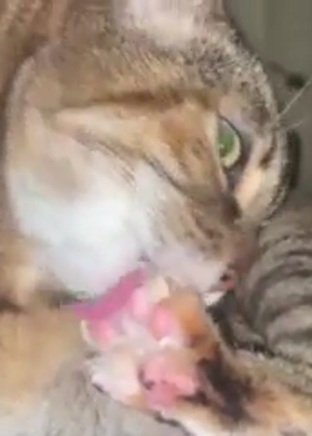 - "brown tabby cat diligently licking its paw" by FM-T5EOT2, licensed under CC BY 4.0