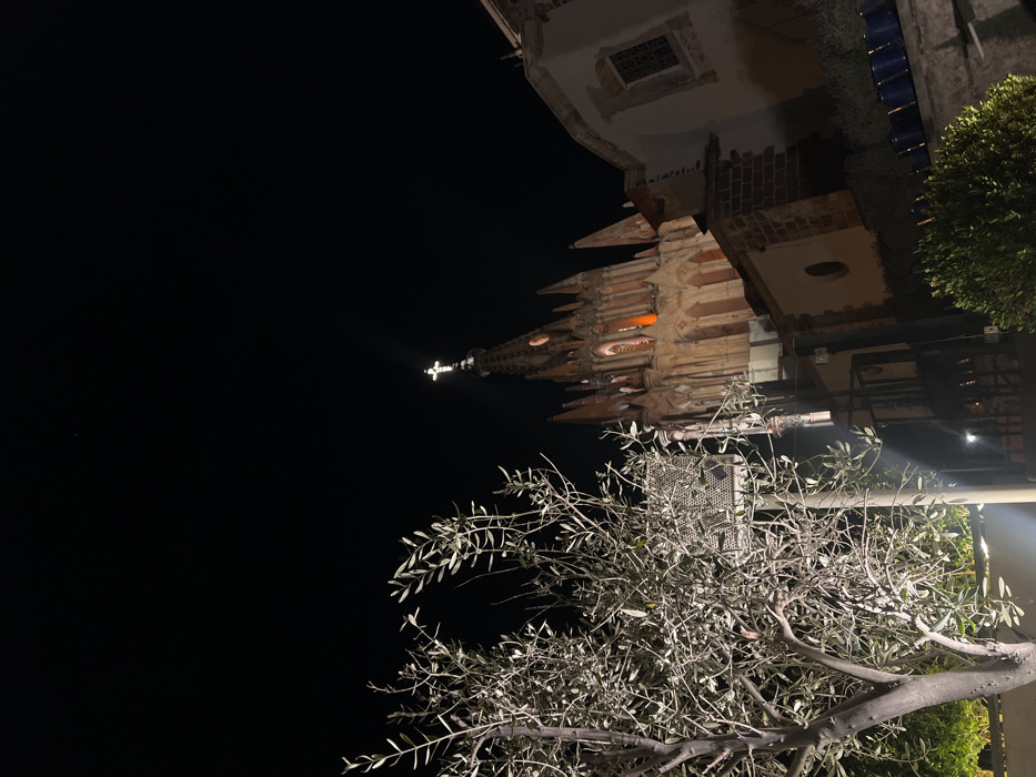 An outdoor night scene features a tall building with a cross at its apex, brightly illuminated against a dark sky. The architectural style appears ornate with spires and decorative elements. Nearby, a tree with thin leaves, also illuminated, fills the lower right portion of the frame. Another portion of a building is visible on the upper right. The image's composition is unusual, being rotated ninety degrees, with the building at the top of the frame seemingly suspended in the night sky.