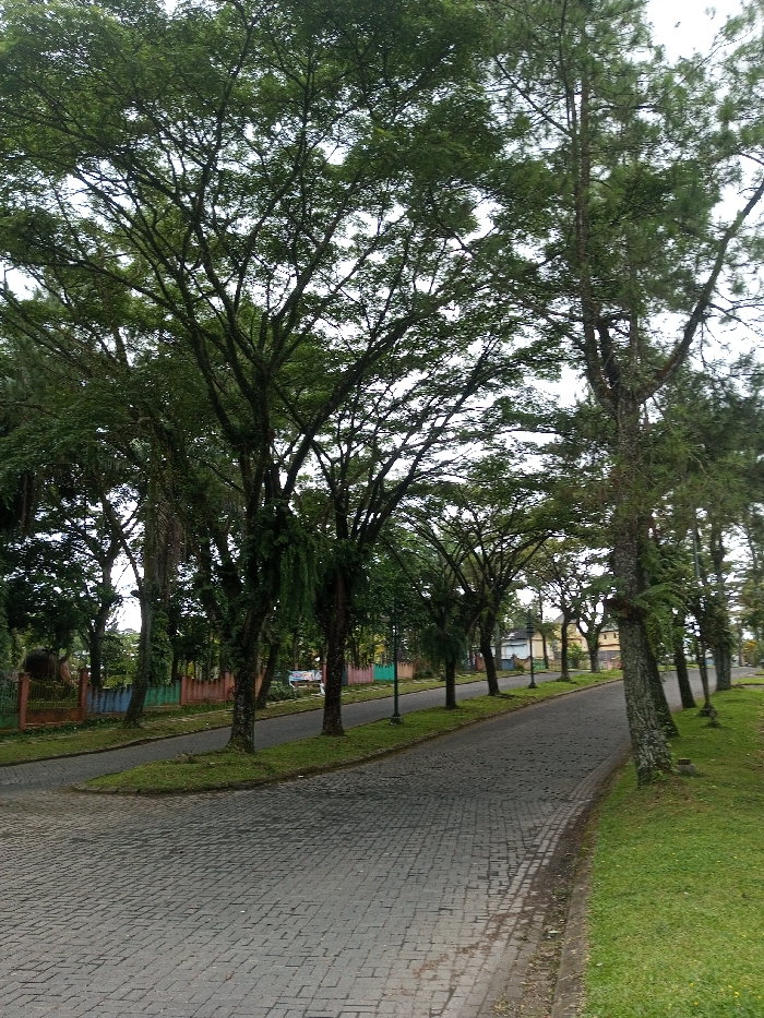 A paved brick road stretches into the distance, lined with tall, mature trees. Green grass borders the road on the right, while a park-like area with colorful fencing is visible on the left. The tree canopy forms a dense covering, obscuring much of the sky. Lamp posts are evenly spaced alongside the road, adding to the orderly and peaceful atmosphere.