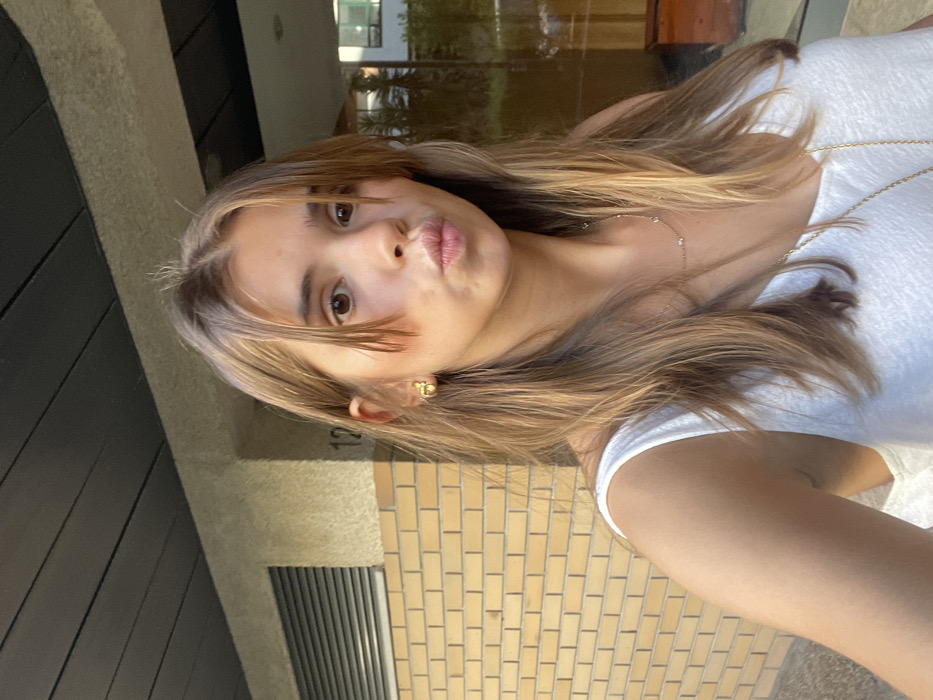 A young female, appearing to be in Aldoar, Foz do Douro e Nevogilde, Portugal, is captured in a selfie-style, chest-up portrait. She has light brown hair with lighter highlights, parted bangs, and brown eyes. Her lips are puckered, and she looks directly at the camera. She wears a white sleeveless top, a small gold-colored earring shaped like an abstract animal in her visible left ear, and two gold-colored necklaces: one shorter with small clear stones, and one longer chain. The background to her left features a light brown brick wall, horizontal blinds, and a beige textured wall with the numeral "12" visible. To her right, a dark, reflective surface, likely a window or door, shows reflections of green foliage and a distant structure. Strong sunlight illuminates the left side of the scene, casting shadows, while the upper right background is darker, likely under an overhang.