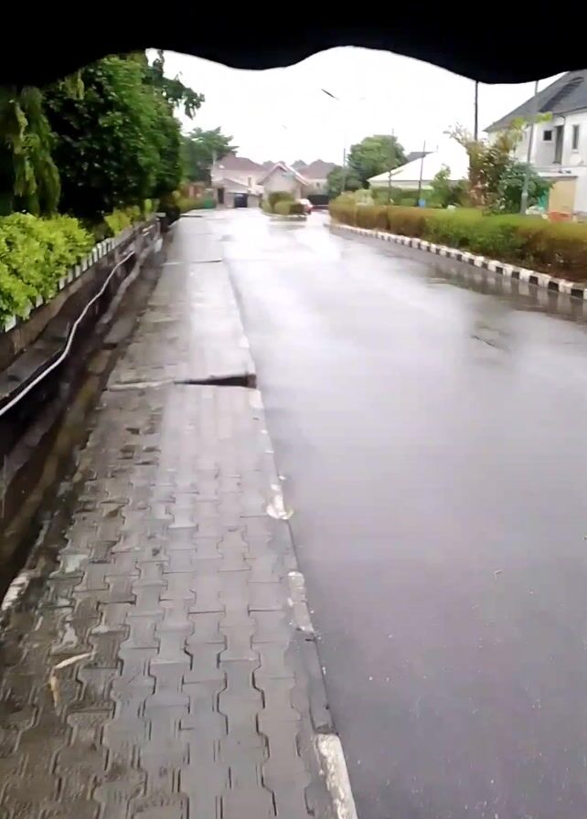 rain-soaked street and sidewalk from under an umbrella. The road is paved and glistens with water, and the sidewalk is made of interlocking brick pavers that are also wet. There are manicured hedges and trees lining the street and sidewalk. The background features buildings and infrastructure elements like streetlights. No people or vehicles are visible on the street. The main action involves the camera moving forward under the umbrella, capturing the scene. The environment is overcast and rainy.