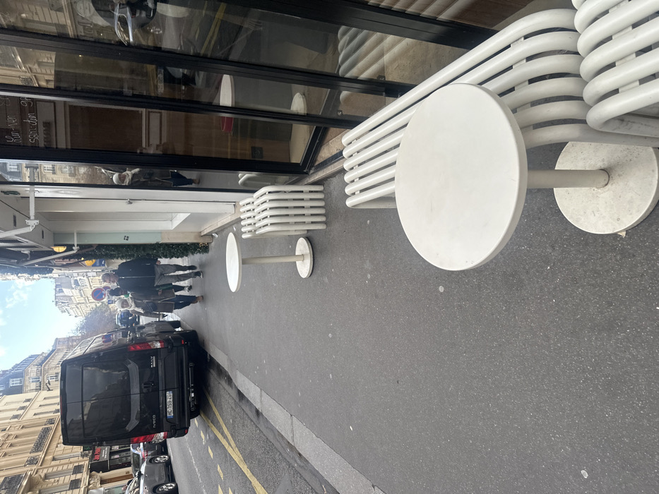 The image depicts a commercial street scene in Paris, France, under natural daylight. In the foreground, two white, circular, pedestal-style café tables are positioned on a dark grey asphalt sidewalk. Adjacent to the closer table on the right is a white, slatted outdoor bench, while near the further table, two similar slatted stools are present. The building façade immediately to the right features large glass panels reflecting the street, with partial text, likely opening hours, visible. Further along the sidewalk, moving from right to left (away from the viewer), three pedestrians are walking. The lead person is a male in a dark jacket, followed by a female in a dark coat and light scarf, and another female partially obscured behind him. On the street to the left of the sidewalk, a black Iveco Daily van with French license plate "MC-159-ZG" is stopped near double yellow lines. Other vehicles are parked further down the street. The background reveals a typical Parisian urban landscape with multi-story Haussmannian-style buildings, many featuring mansard roofs. Bare deciduous trees line the street, and a red and white "no parking" sign is visible in the distance. The sky is partly cloudy.