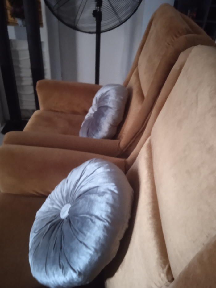 This image depicts an indoor scene within a property in the city of Lagos, Nigeria. The foreground and midground are dominated by two sections of a tan or caramel-colored upholstered sofa or armchair. The upholstery appears to be a plush fabric, possibly velvet, characterized by visible folds and soft contours. Two circular, tufted decorative pillows, light grey or silver in color and also likely made of velvet, are positioned on the furniture. One pillow rests on the nearest seat section, while the second is further back on an adjacent section. In the background, partially obscured, is a black standing floor fan with a circular cage. The environment is dimly lit, with a light-colored wall visible behind the fan. No people, animals, or active interactions are present; the scene is static.