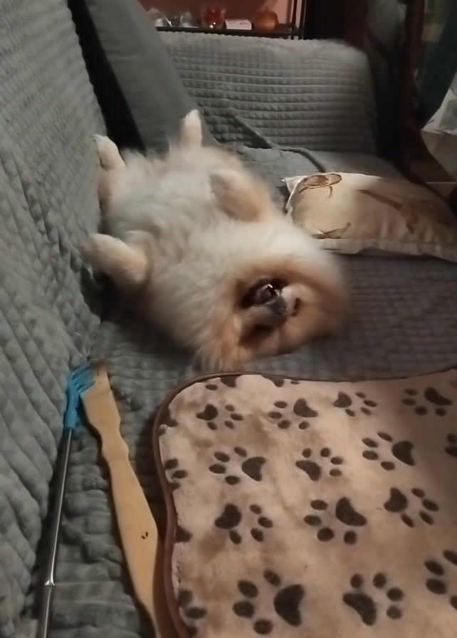 A small, fluffy Pomeranian-type dog is lying on its back on a gray couch. The dog has a light orange and white coat and is positioned sideways, with its head near the center of the frame and its paws in the air. The couch has a textured gray fabric and is lined with pillows and cushions. To the right of the dog is a beige pillow with a simple pattern, and below the dog is a patterned mat with brown paw prints on a light brown background, surrounded by a wooden edge. To the left, there is a blue-handled brush with an extendable metal rod and a wooden paddle brush. In the background, a dark shelving unit is visible, displaying various small objects and decorations. The room is softly lit, suggesting an indoor setting, possibly a living room.