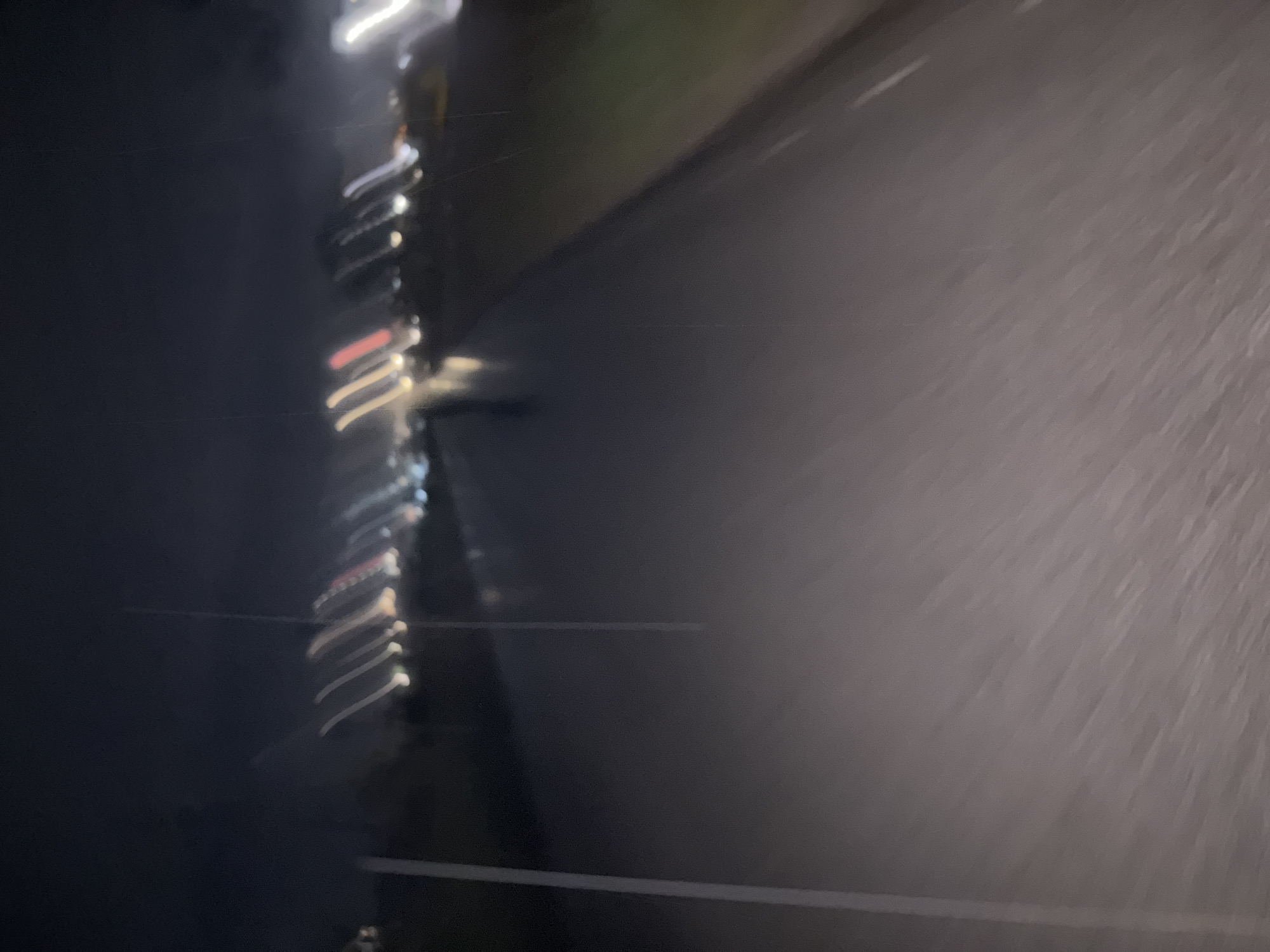 The image depicts a blurred night scene, likely taken from a moving vehicle