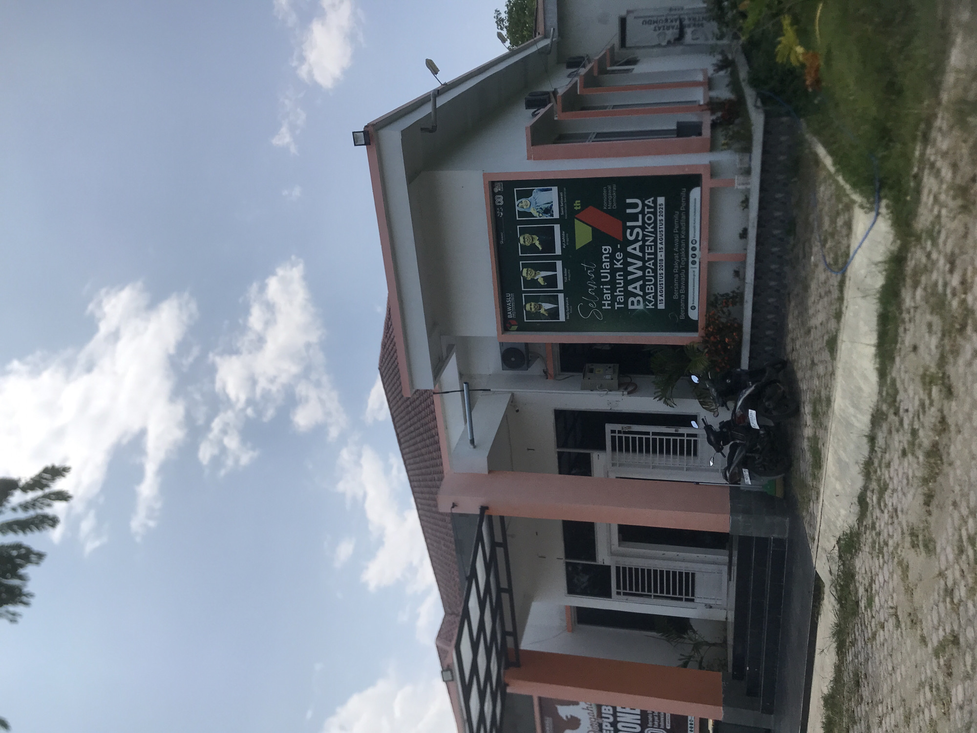 building in Lhokseumawe, Indonesia, adorned with a banner celebrating Bawaslu's anniversary. A motorcycle is parked nearby. The sky is partly cloudy. The building is white with orange trim. There are plants around the perimeter.